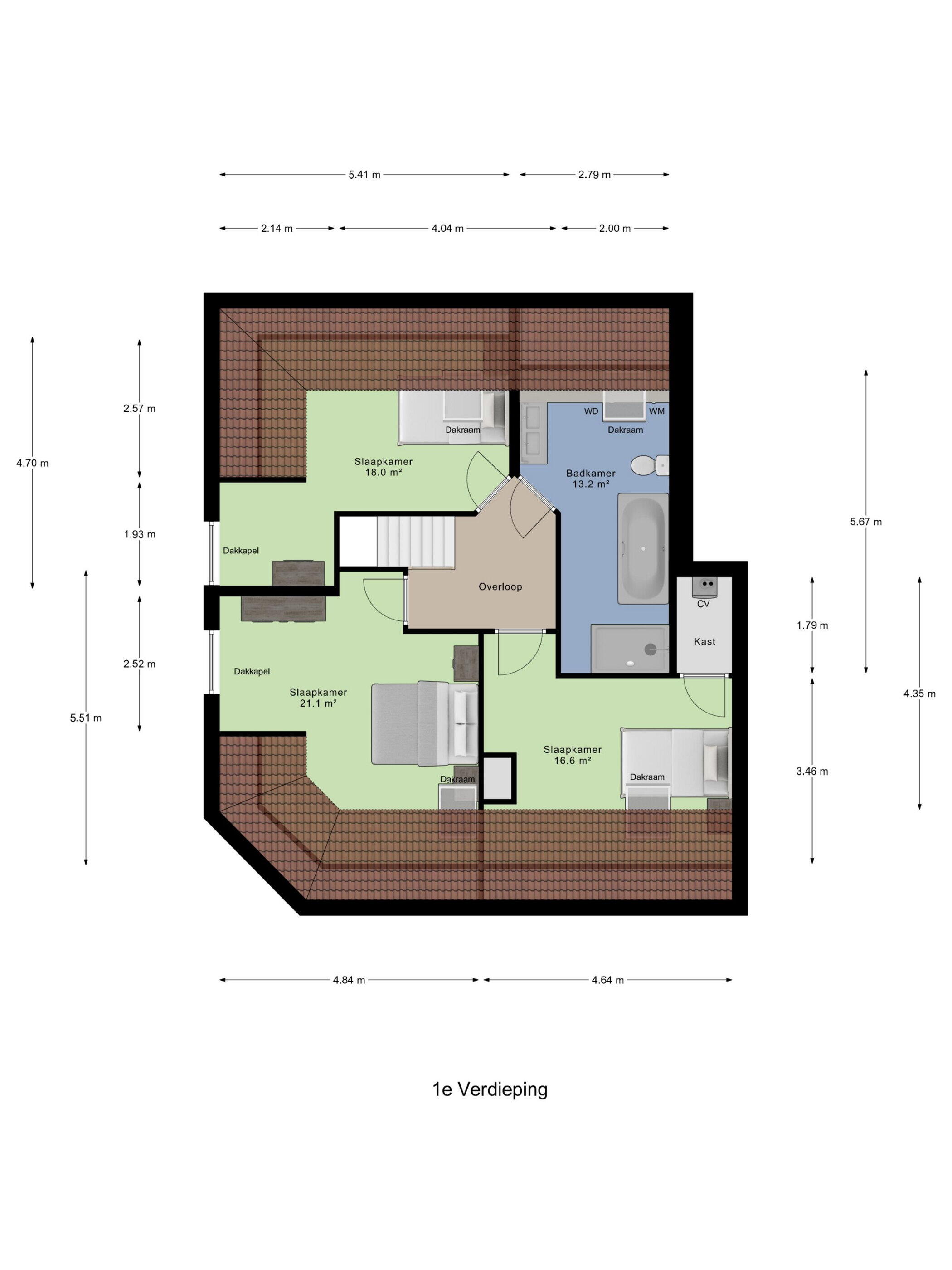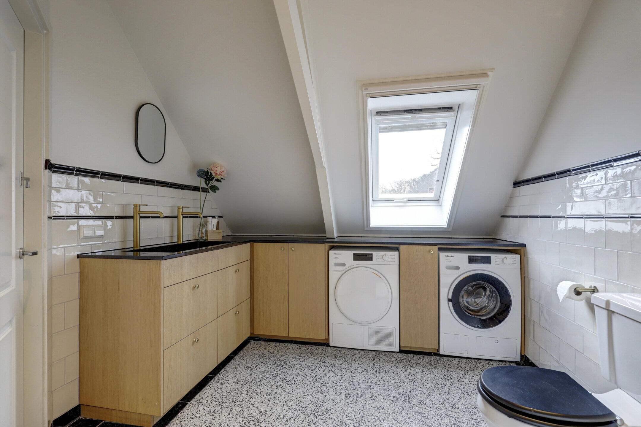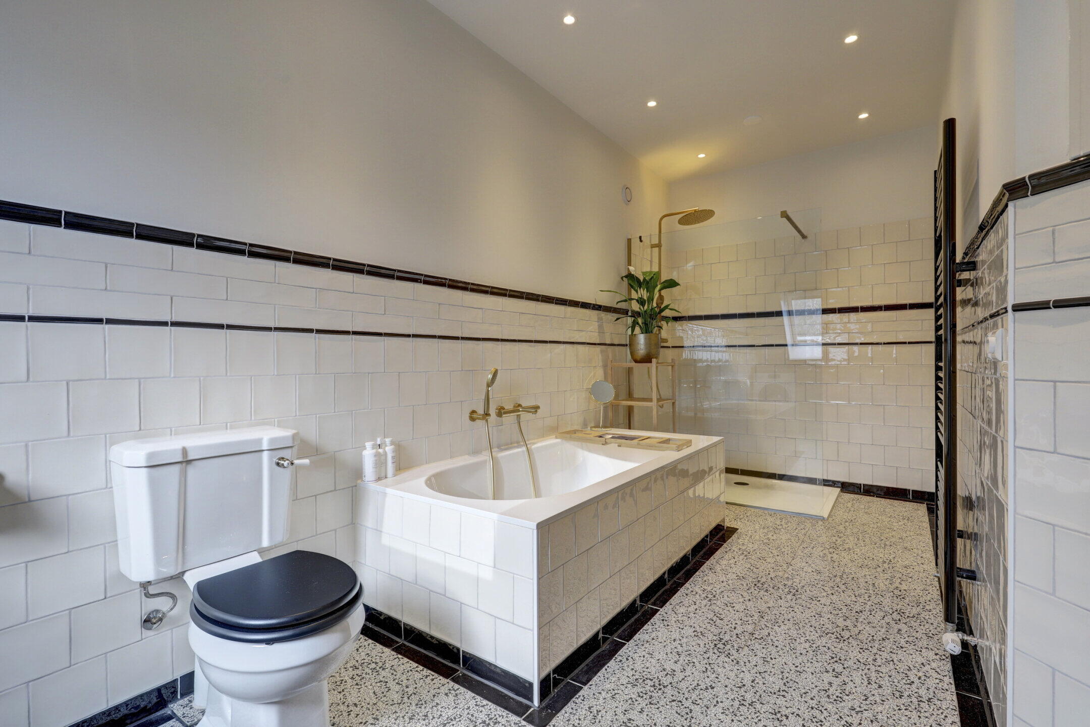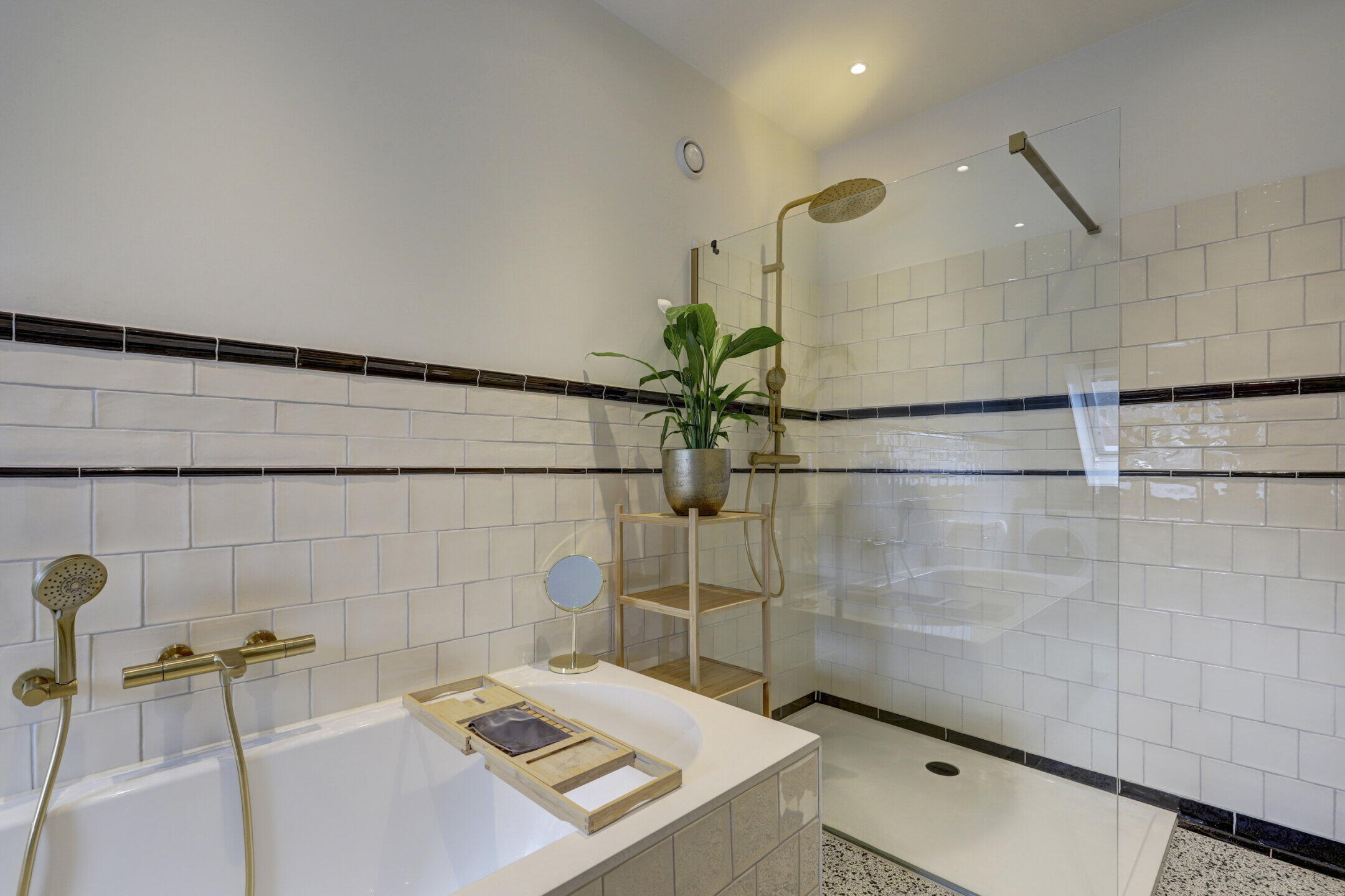 - Ligbad, toilet, dubbele wastafel, wastafelmeubel, inloopdouche, wasmachineaansluiting